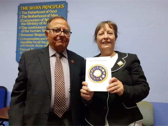 Hindu speaker Ravinda Nathwani presents the Universal Prayer Book to Minister Kim Moore-Cullen at an Interfaith event at Paignton SC • 2022